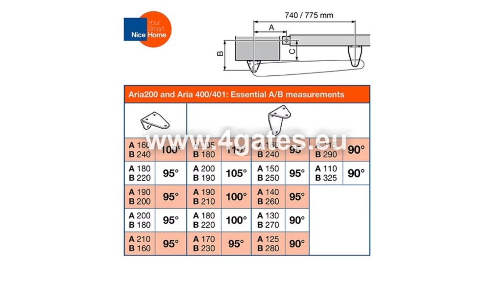 NiceHome Aria 200 tiibvärava automaatika on mõeldud kahekordsetele tiibväravatele, mille tiiva pikkus on kuni 2,2 m või kaal kuni 250 kg.